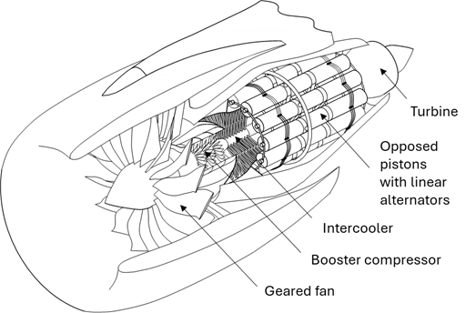 In a preferred engine concept from Cranfield University, the exhaust from a turbocharged multi-cylinder set of opposed free piston gas generators drives a turbine that powers the fan. The free piston gas generators also generate electric power via linear alternators and this is used to help drive the fan and booster compressor, giving a significant improvement in overall efficiency relative to a conventional turbofan engine. The experiments to be conducted at Cranfield will investigate alternative fuel injection and ignition systems to maximise efficiency and minimise NOx emissions for hydrogen-fuelled engines.